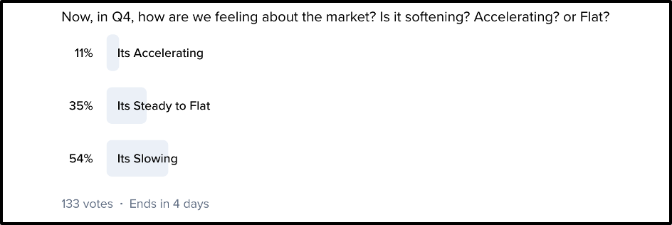 Looking ahead to Q4, the conclusion of political advertising— typically a significant driver of market activity in this quarter, though less so for Reklaim—will provide a clearer view of organic market growth as we approach 2025. While projections for Q4 remain positive, there are signs of concern among the seller community. Reklaim’s recent survey of 133 industry sellers highlights a potential market softening: 54% reported a slowdown in spending, 35% indicated stability, and only 11% observed growth. This is a slight improvement over our Q2 survey, which highlighted 63% of sellers thought the market was slowing. These insights from frontline sellers, who interact closely with market dynamics daily, underscore the need for cautious optimism. At Reklaim, however, we anticipate continued revenue acceleration, driven by an expanded network of sellers and increased brand recognition, positioning us to capitalize on broader market reach and deeper client engagement.